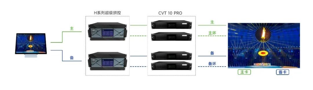 通過雙機4重備份保證現場畫面顯示萬無一失。使用2套系統同時連接顯示屏,雙通道同時輸出信號,4張發送卡連接箱體主、備接收卡建立信號回路,任意環節故障,立即按照優先級迅速替換備份信號,整個切換時間控制在微秒級別,確保顯示屏在顯示上不會出現任何異常現象。